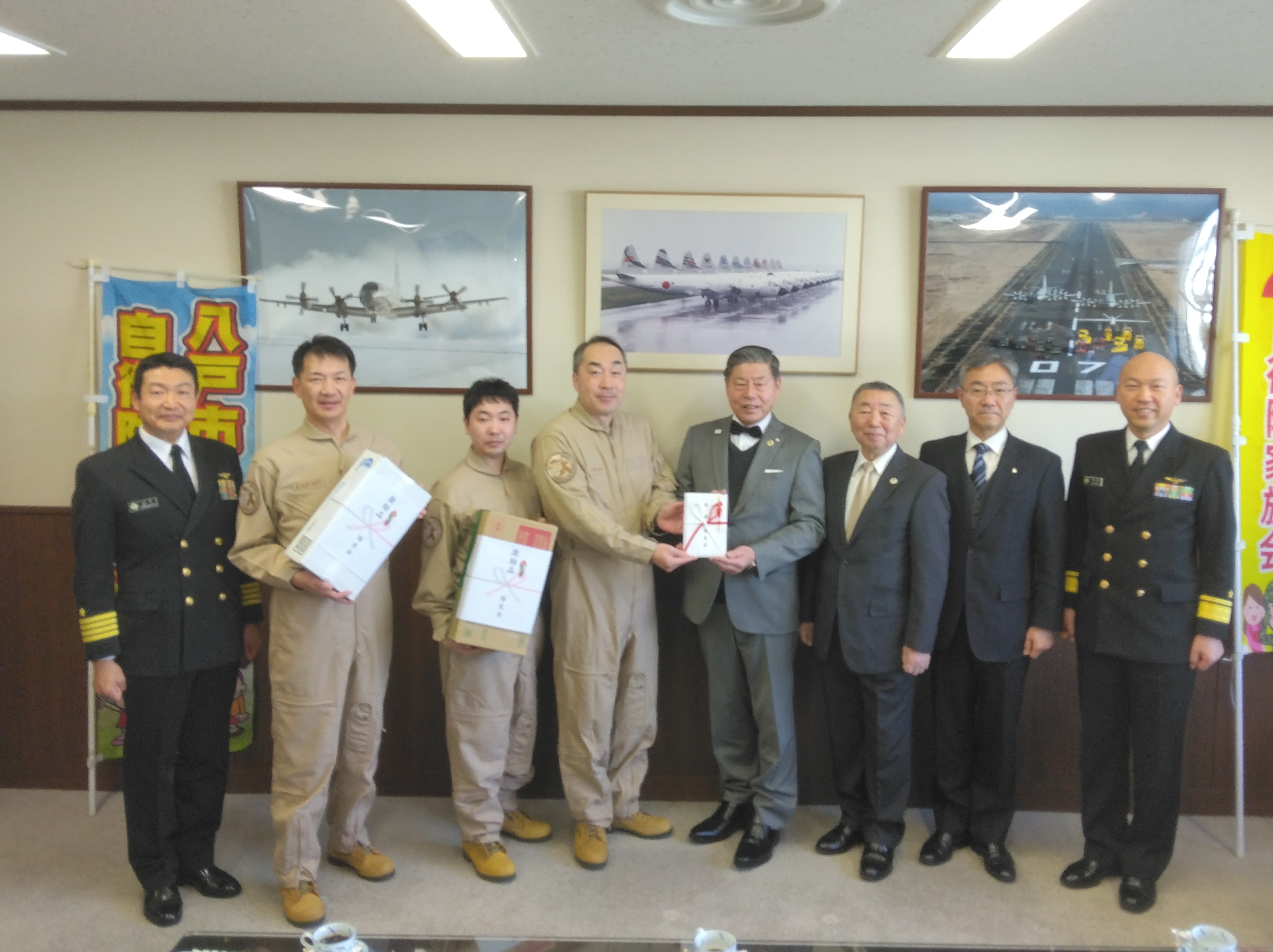 写真下:松本司令に激励品を贈呈する支部長 写真上:見送りを受けるP-3C