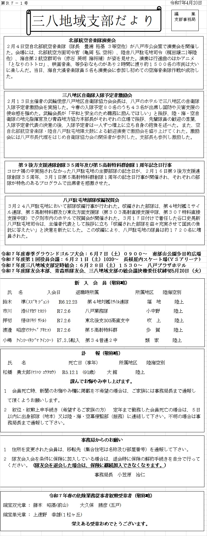 知し、部隊行事等の案内が三沢分会に配布されるようにし、三沢の活動の活性化を